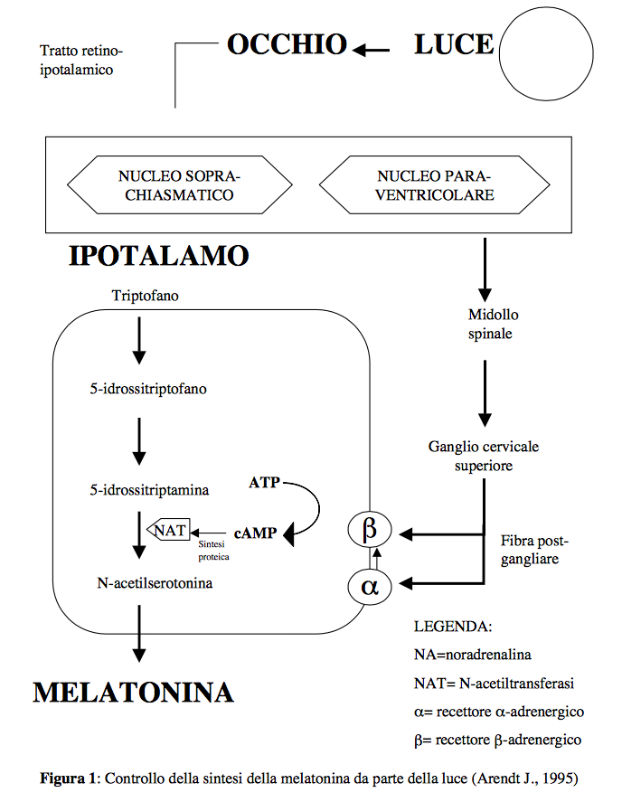 Il RUOLO DELLA LUCE NELLA SINTESI DELLA MELATONINA: I cicli luce-buio giornalieri e stagionali sincronizzano il ritmo endogeno della melatonina (Rusak B. & Zucer I., 1979). La luce ha due effetti sul ritmo giornaliero di sintesi e secrezione della melatonina: a) sopprime la sua produzione in maniera dose-risposta (Lewy et al., 1980), b) traina il pacemaker ipotalamico nello stabilire la fase del ritmo riferita al ciclo di luce-buio (Tamarkin L. et al., 1985).